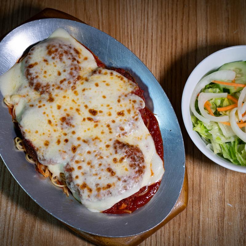 Chicken Parmigiana over a bed of spaghetti with a side salad