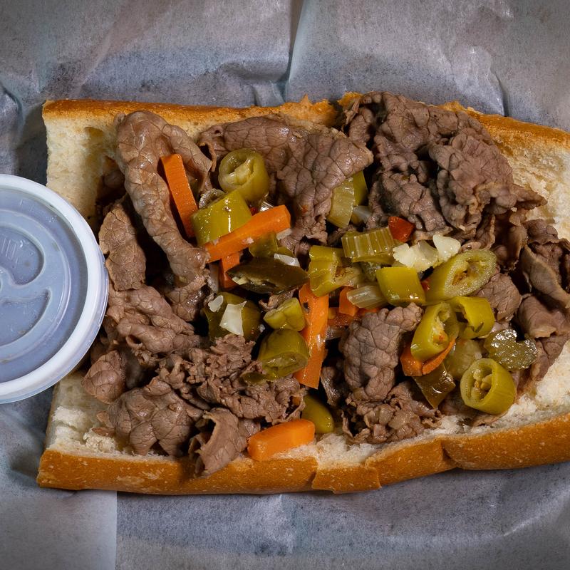 Med. $21.50 | Lg. $24.50 | XL. $27.50 • Italian Beef and Giardiniera